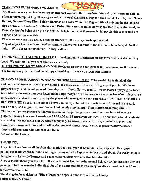 If anyone has anything that they may want to share with the rest of the community or If anyone has any new ideas or comments for the lakeside Terrace web page please let Rich know and send it to him at LTseagull@aol.com and please include your name. If you want to be added to the mailing list or removed from it just send Rich your e-mail address and your name. You can also e-mail him from the lakeside Terrace web site: lakesideterrace.net
